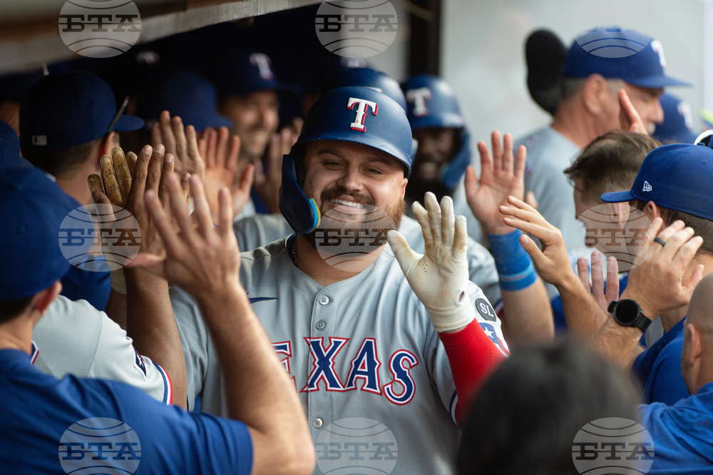 Texas Rangers' Rowdy Tellez is greeted by teammates after hitting a three-run home run off Cleveland Guardians relief pitcher Zak Kent during the tenth inning of a baseball game, Sunday, Sept. 28, 2025, in Cleveland. (AP Photo/Phil Long)