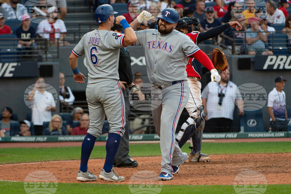 Texas Rangers' Josh Jung (6) congratulates Rowdy Tellez, right, for his three-run home run off Cleveland Guardians relief pitcher Zak Kent during the 10th inning of a baseball game, Sunday, Sept. 28, 2025, in Cleveland. (AP Photo/Phil Long)