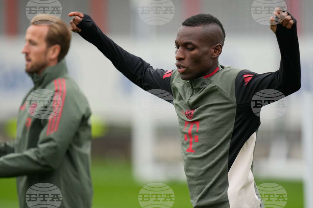 Bayern's Harry Kane warms up during a training session besides team mate Nicolas Jackson in Munich, Germany, Monday, Sept. 29, 2025, ahead of the Champions League opening phase soccer match between Pafos FC and FC Bayern. (AP Photo/Matthias Schrader)
