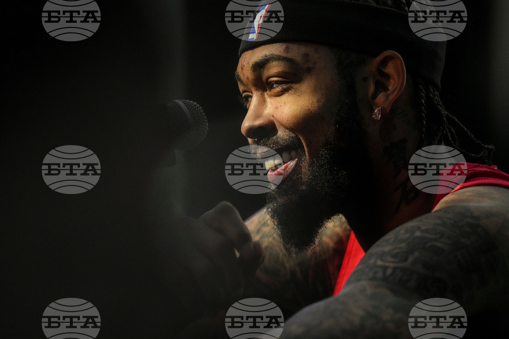 Brandon Ingram speaks at the Toronto Raptors media day in Toronto on Monday, September 29, 2025. (Chris Young/The Canadian Press via AP)