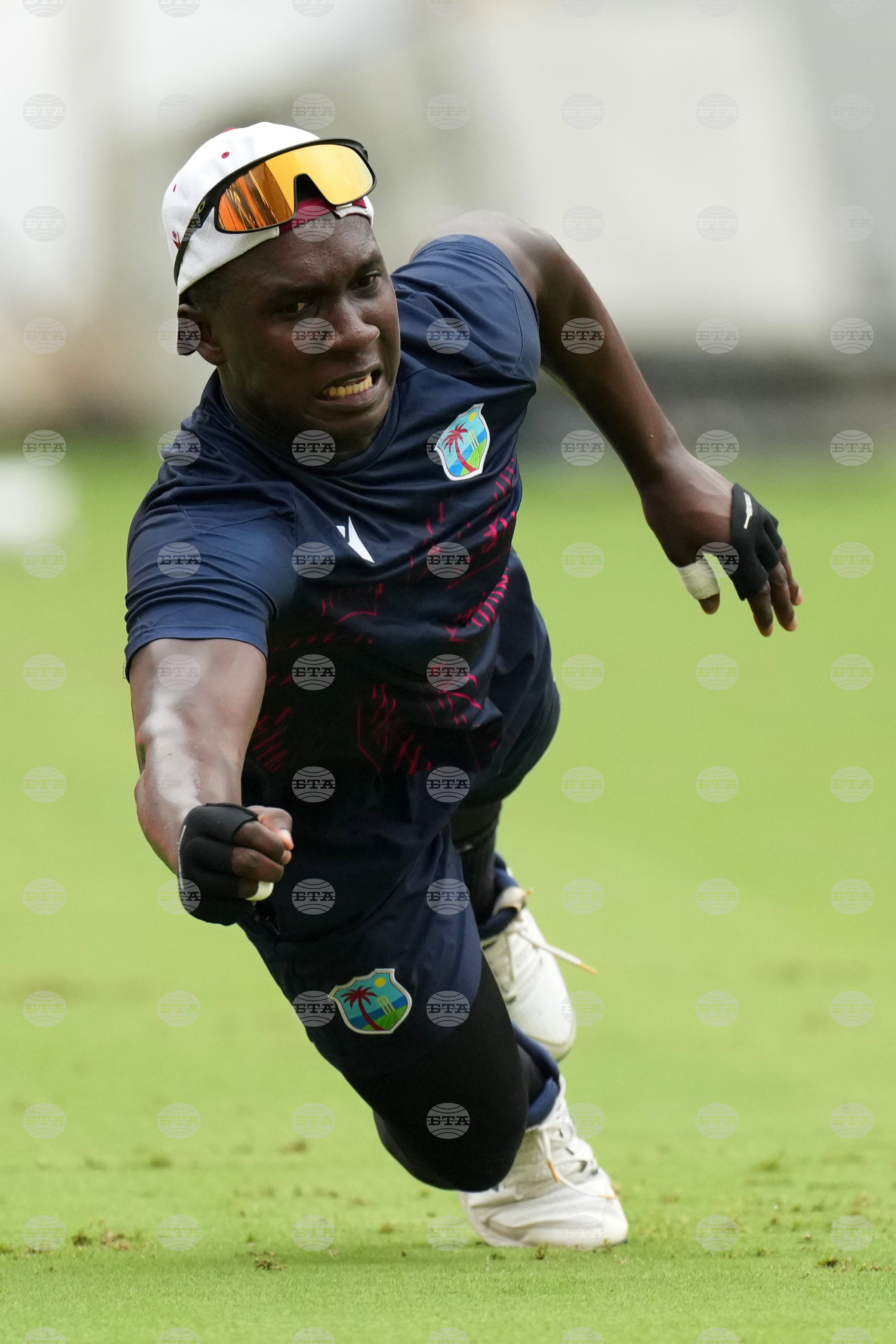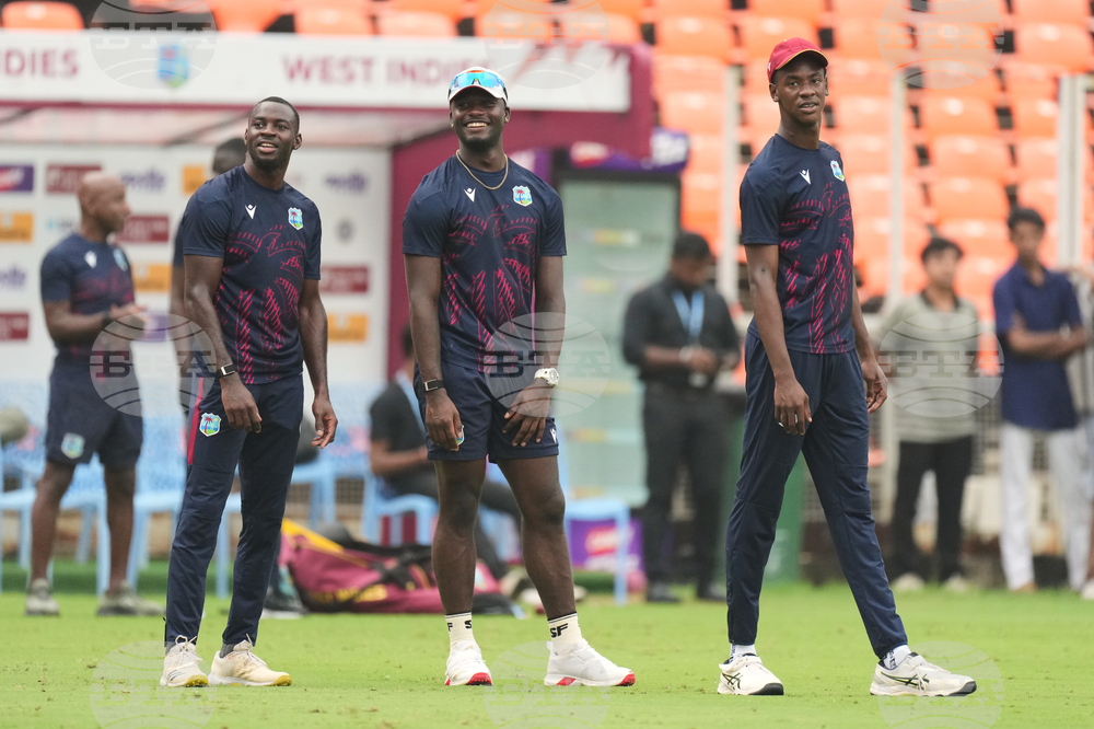West Indies' players attend a practice session ahead of the first Test cricket match against India at Narendra Modi Stadium in Ahmedabad, India, Tuesday, Sept. 30, 2025. (AP Photo/Ajit Solanki)