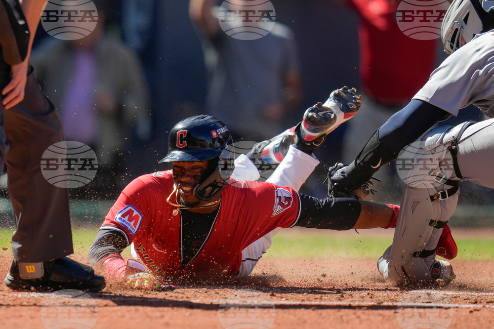 Cleveland Guardians' Angel Martínez scores on a single hit by Gabriel Arias as Detroit Tigers catcher Dillon Dingler, right, reaches with the tag during the fourth inning of Game 1 of the American League Wild Card baseball playoff series in Cleveland, Tuesday, Sept. 30, 2025. (AP Photo/Sue Ogrocki)