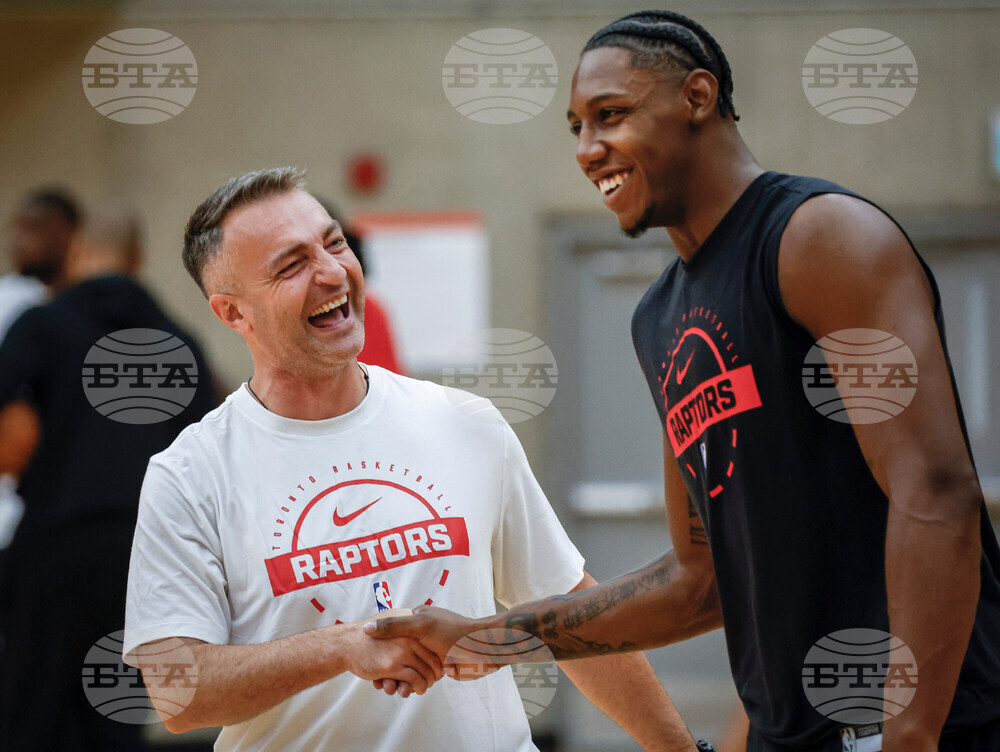 Toronto Raptors' Ochai Agbaji laughs with teammates during NBA basketball training camp in Calgary, Alberta, Tuesday, Sept. 30, 2025. (Jeff McIntosh/The Canadian Press via AP)