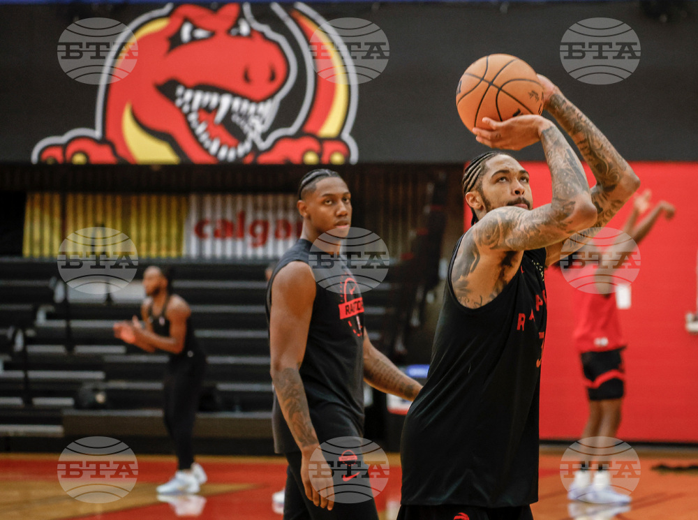 Toronto Raptors' Brandon Ingram shoots during NBA basketball training camp in Calgary, Alberta, Tuesday, Sept. 30, 2025. (Jeff McIntosh/The Canadian Press via AP)