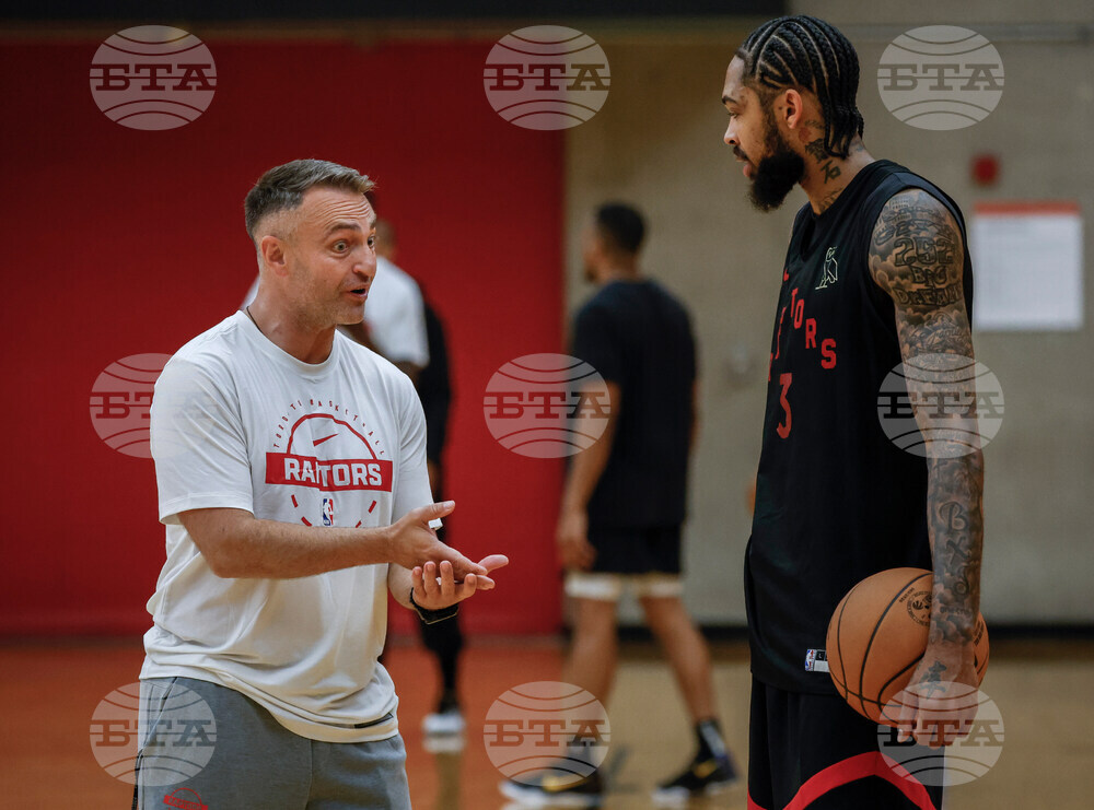Toronto Raptors head coach Darko Rajakovic, left, talks with Brandon Ingram during NBA basketball training camp in Calgary, Alberta, Tuesday, Sept. 30, 2025. (Jeff McIntosh/The Canadian Press via AP)