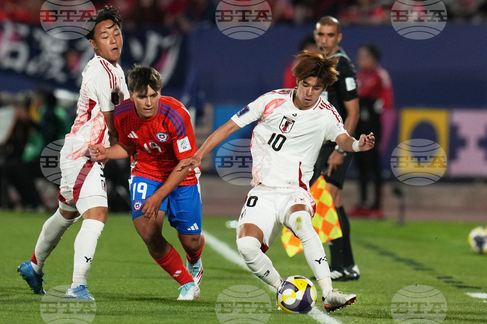 Japan's Soma Kanda, left, and Chile's Ian Garguez vie for the ball during a FIFA U-20 World Cup Group A soccer match at National Stadium in Santiago, Chile, Tuesday, Sept. 30, 2025. (AP Photo/Matias Delacroix)
