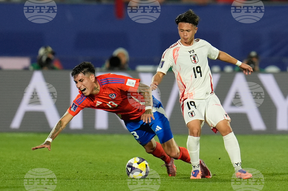 Chile's Willy Chatiliez, left, and Japan's Shunsuke Saito vie for the ball during a FIFA U-20 World Cup Group A soccer match at National Stadium in Santiago, Chile, Tuesday, Sept. 30, 2025. (AP Photo/Matias Delacroix)