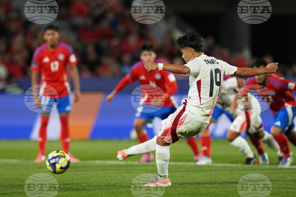 Japan's Yumeki Yokoyama, right, scores his side's 2nd goal against Chile during a FIFA U-20 World Cup Group A soccer match at National Stadium in Santiago, Chile, Tuesday, Sept. 30, 2025. (AP Photo/Matias Delacroix)