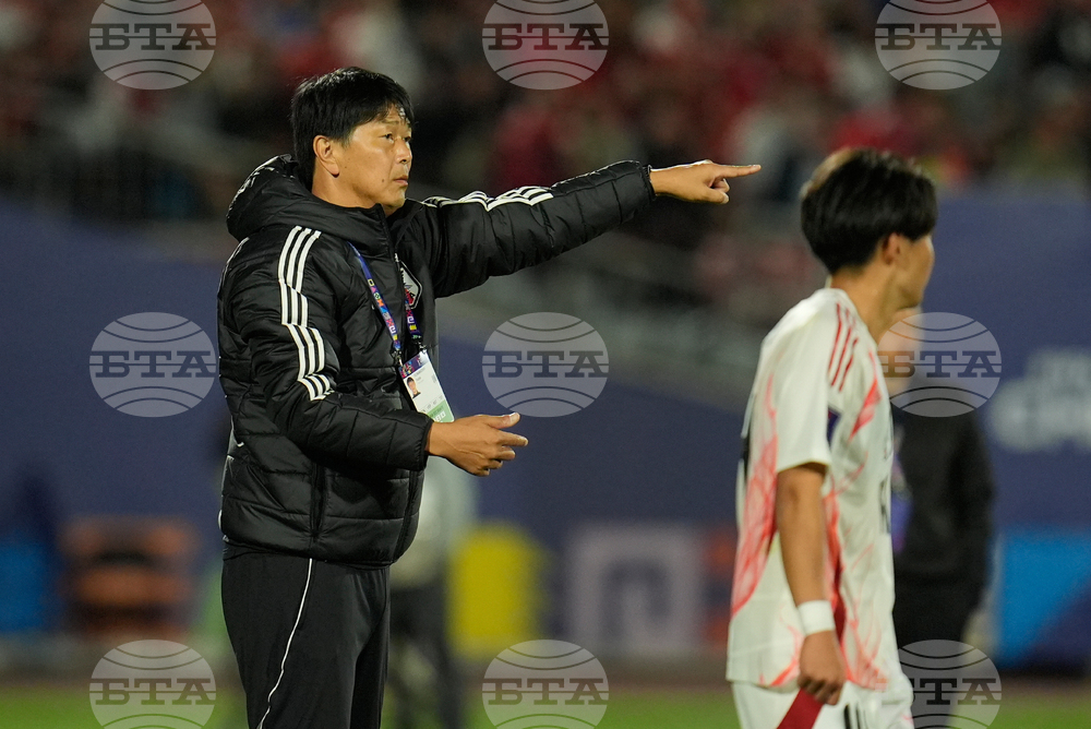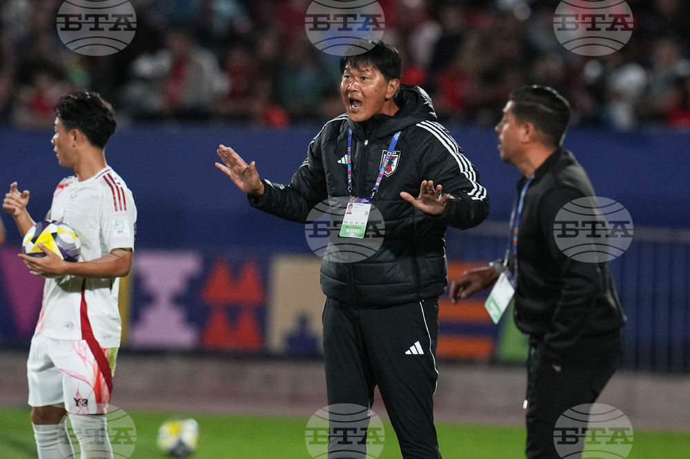 Japan's coach Yuzo Funakoshi gives instructions during a FIFA U-20 World Cup Group A soccer match against Chile at National Stadium in Santiago, Chile, Tuesday, Sept. 30, 2025. (AP Photo/Matias Delacroix)