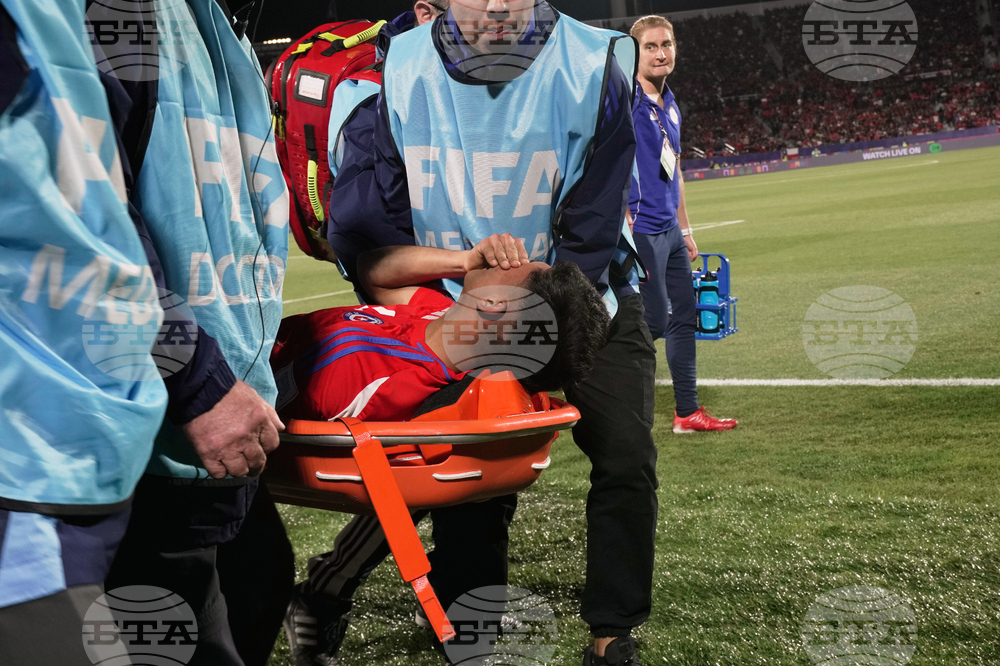 Chile's Emiliano Ramos is carried off the pitch by medical staff after being injured during a FIFA U-20 World Cup Group A soccer match against Japan at National Stadium in Santiago, Chile, Tuesday, Sept. 30, 2025. (AP Photo/)
