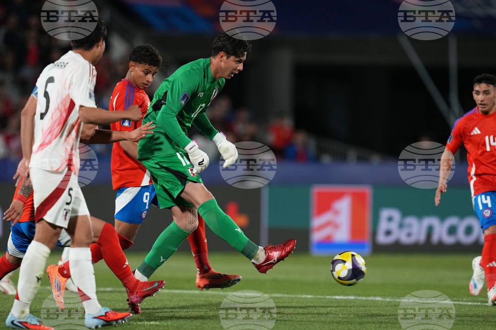 Chile's Willy Chatiliez tries to reach the ball during a FIFA U-20 World Cup Group A soccer match against Japan at National Stadium in Santiago, Chile, Tuesday, Sept. 30, 2025. (AP Photo/Matias Delacroix)