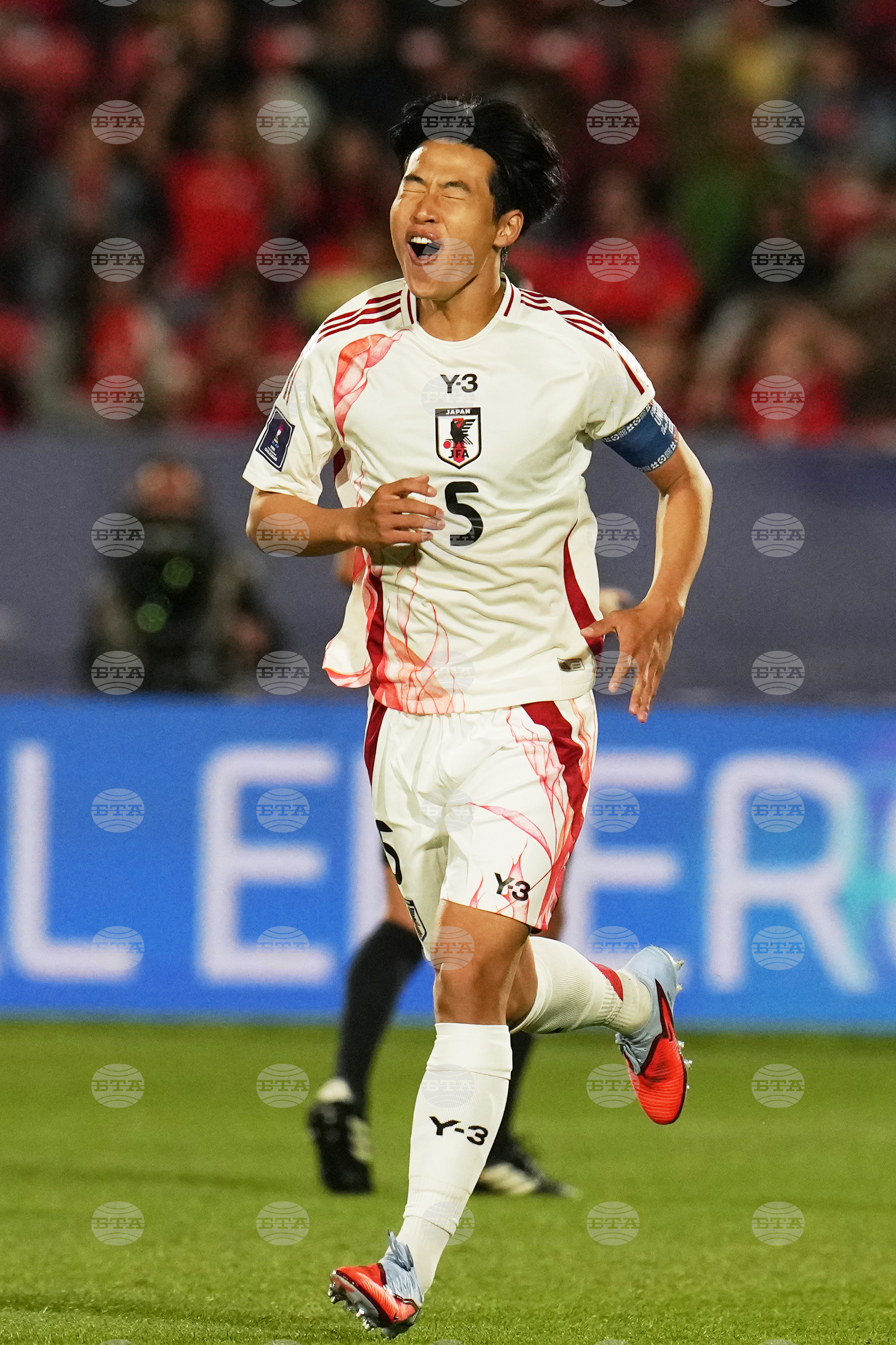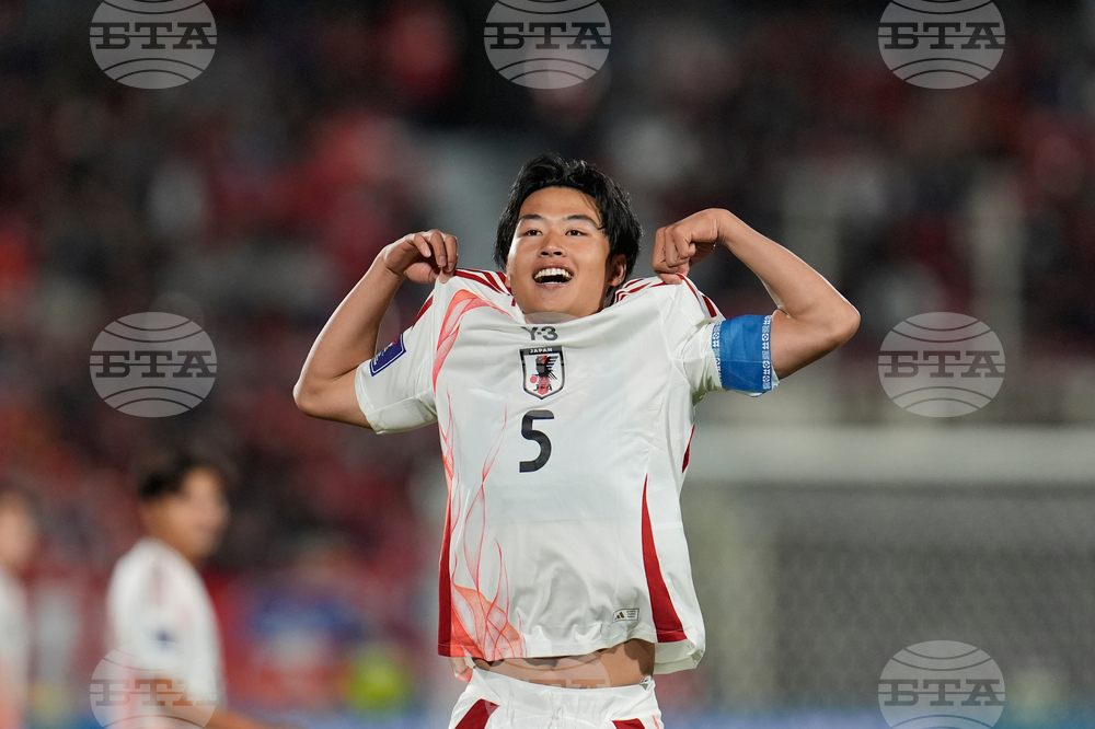 Japan's Yumeki Yokoyama celebrates scoring his side's 2nd goal against Chile during a FIFA U-20 World Cup Group A soccer match at National Stadium in Santiago, Chile, Tuesday, Sept. 30, 2025. (AP Photo/Matias Delacroix)