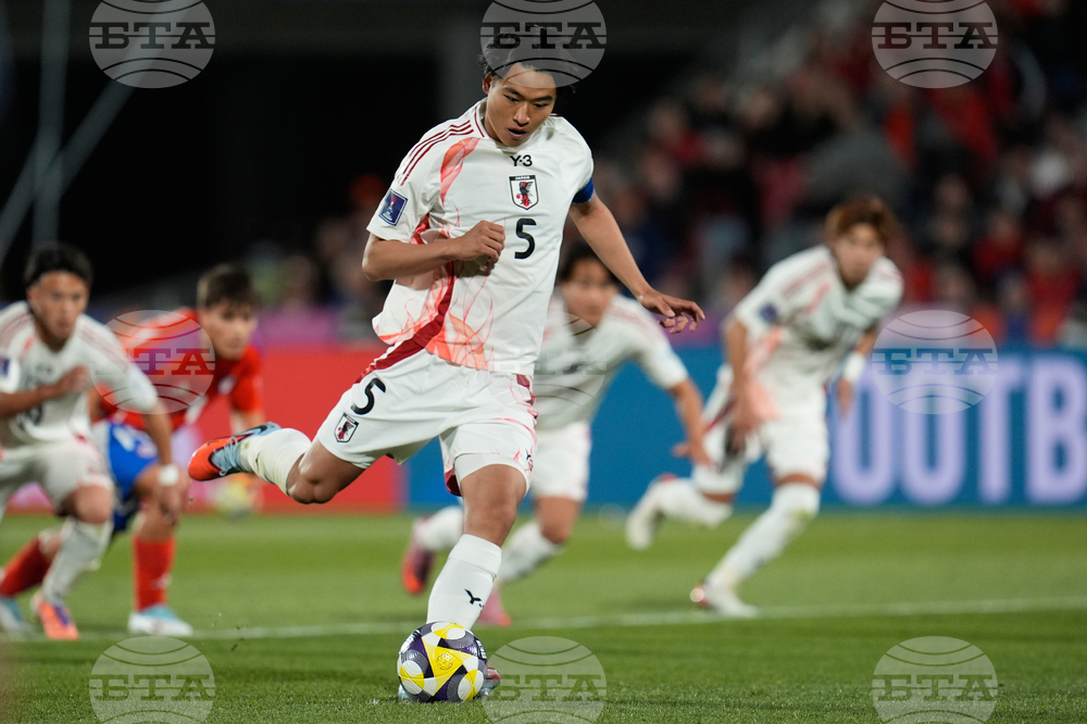 Japan's Kazunari Kita tries to reach the ball during a FIFA U-20 World Cup Group A soccer match against Japan at National Stadium in Santiago, Chile, Tuesday, Sept. 30, 2025. (AP Photo/Matias Delacroix)