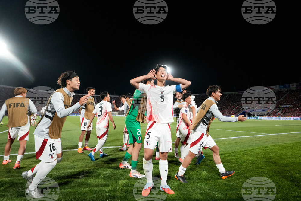 Japan's players celebrate after beating Chile 2-0 during a FIFA U-20 World Cup Group A soccer match at National Stadium in Santiago, Chile, Tuesday, Sept. 30, 2025. (AP Photo/Matias Delacroix)