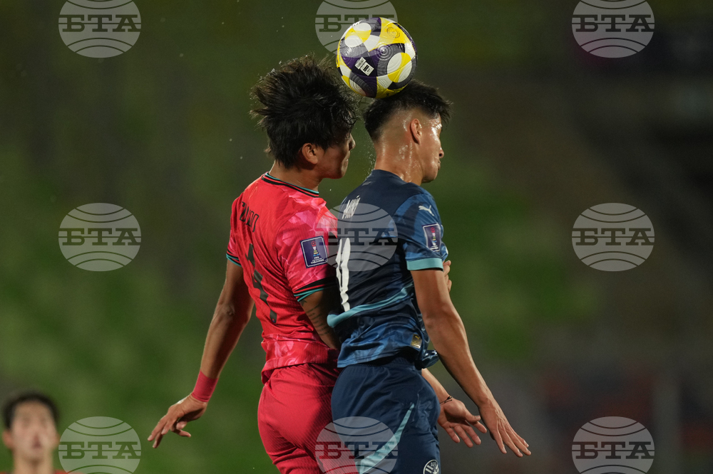 Paraguay's David Fernandez, front, and South Korea's Son Seung-min vie for a header during a FIFA U-20 World Cup Group B soccer match at Elias Figueroa Brander stadium in Valparaiso, Chile, Tuesday, Sept. 30, 2025. (AP Photo/Andre Penner)