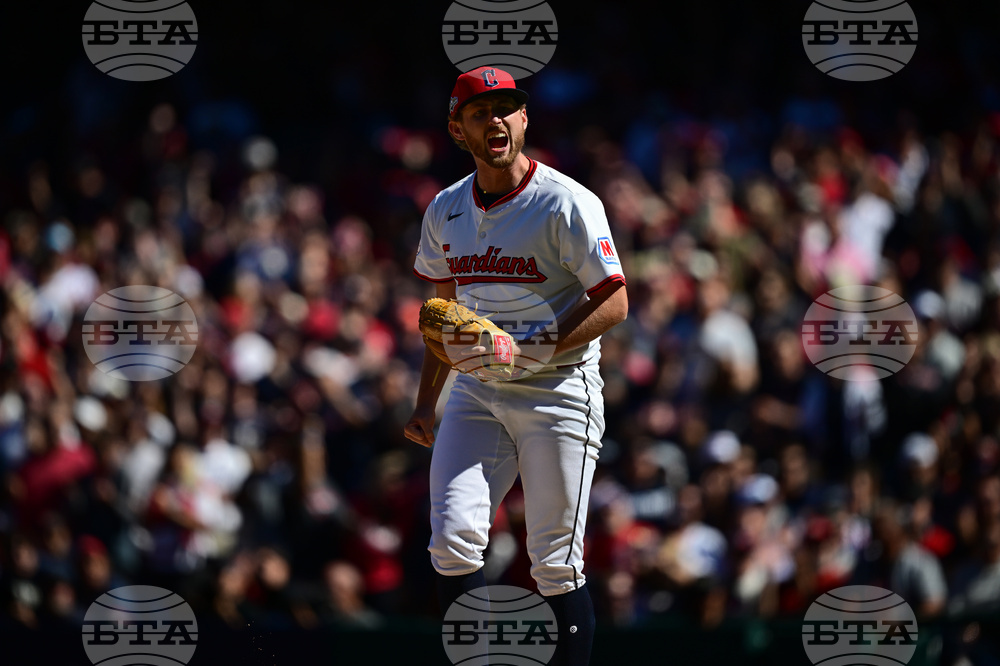 Cleveland Guardians pitcher Tanner Bibee reacts after striking out Detroit Tigers' Riley Greene in the first inning of Game 2 of the American League Wild Card baseball playoff series in Cleveland, Wednesday, Oct. 1, 2025. (AP Photo/David Dermer)