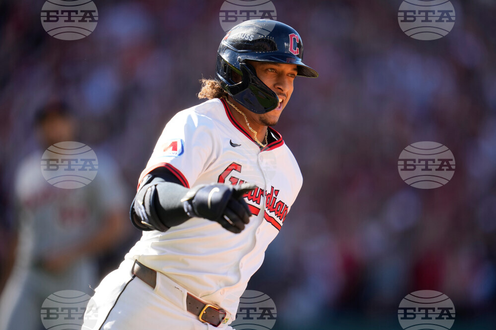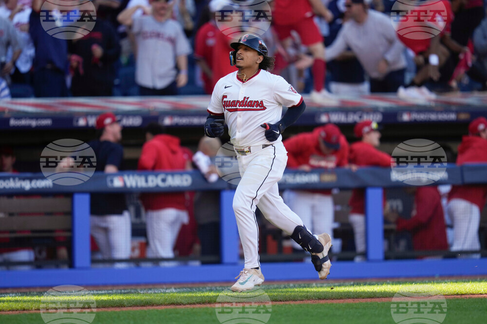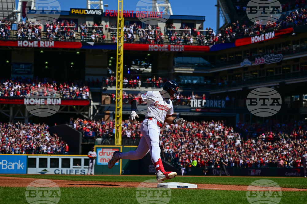Cleveland Guardians' George Valera rounds the bases after hitting a solo home run in the first inning of Game 2 of the American League Wild Card baseball playoff series against the Detroit Tigers in Cleveland, Wednesday, Oct. 1, 2025. (AP Photo/David Dermer)