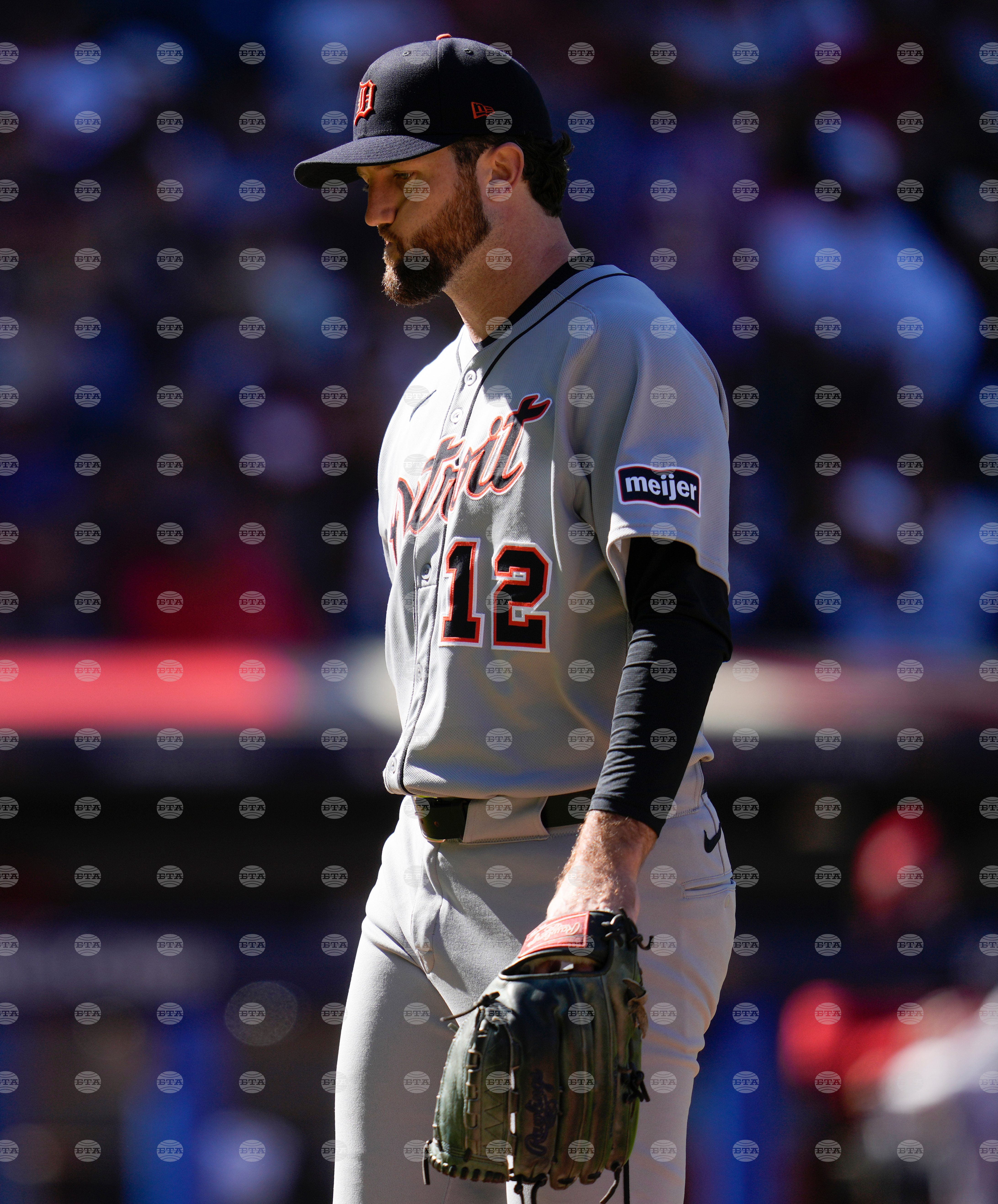 Detroit Tigers pitcher Casey Mize (12) walks from the pitching mound to the dugout during a pitching change as manager A.J. Hinch (14) is right, in the fourth inning of Game 2 of the American League Wild Card baseball playoff series against the Cleveland Guardians in Cleveland, Wednesday, Oct. 1, 2025. (AP Photo/Sue Ogrocki)