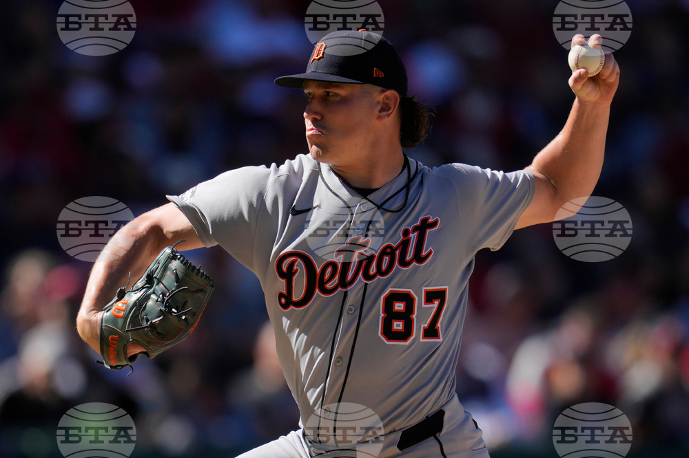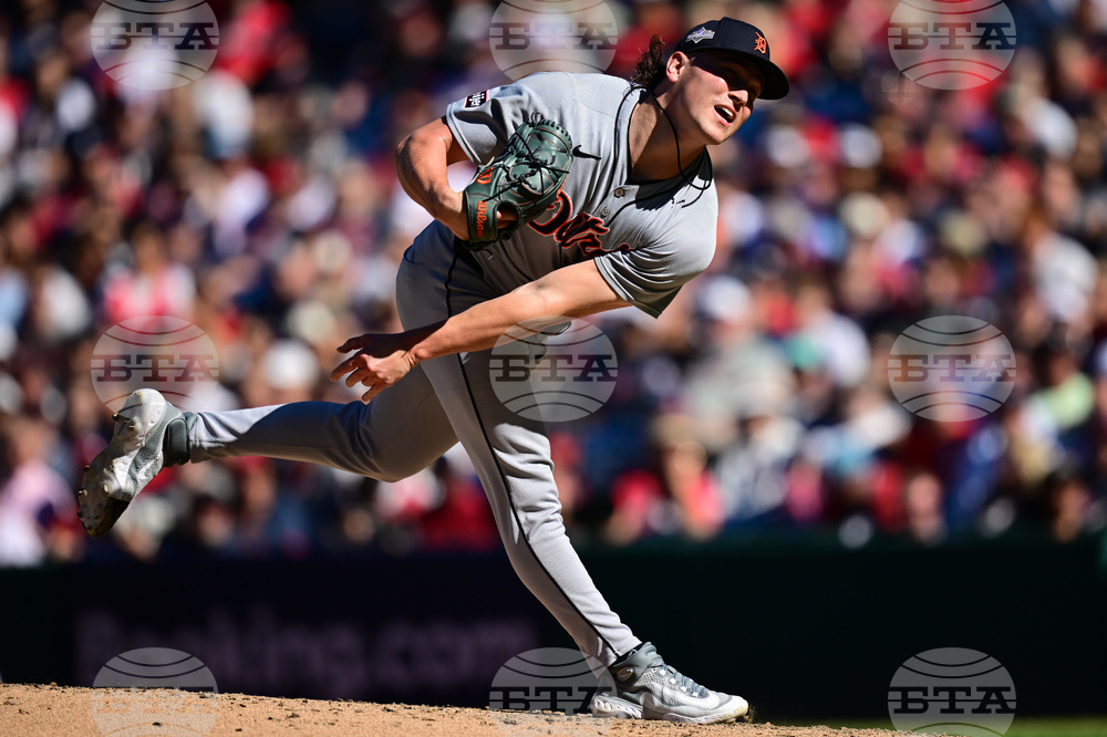 Detroit Tigers pitcher Casey Mize throws in the first inning of Game 2 of the American League Wild Card baseball playoff series against the Cleveland Guardians in Cleveland, Wednesday, Oct. 1, 2025. (AP Photo/David Dermer)
