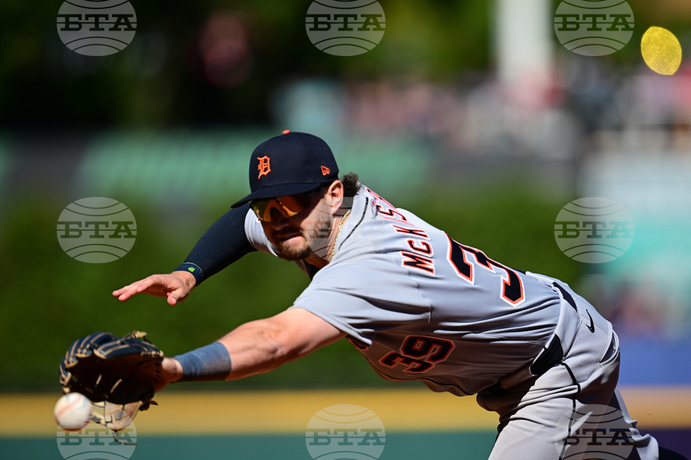 Detroit Tigers third baseman Zach McKinstry dives for but misses a ball hit by Cleveland Guardians' C.J. Kayfus in fifth inning of Game 2 of the American League Wild Card baseball playoff series in Cleveland, Wednesday, Oct. 1, 2025. (AP Photo/David Dermer)