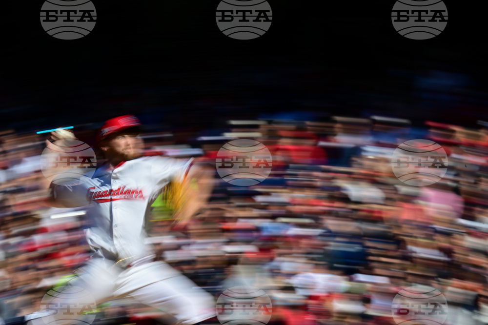In this image taken with a slow shutter speed, Cleveland Guardians starting pitcher Tanner Bibee throws in the fifth inning of Game 2 of the American League Wild Card baseball playoff series against the Detroit Tigers in Cleveland, Wednesday, Oct. 1, 2025. (AP Photo/David Dermer)