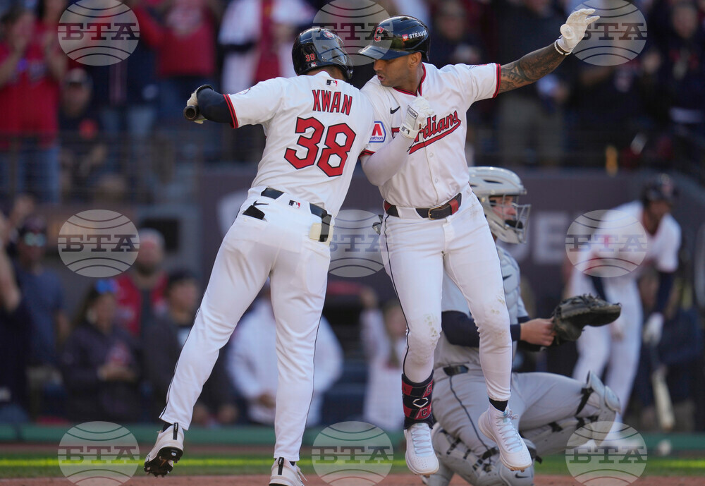 Cleveland Guardians left fielder Steven Kwan (38) and Cleveland Guardians second base Daniel Schneemann (10) celebrate after winning Game 2 of the American League Wild Card baseball playoff series against the Detroit Tigers in Cleveland, Wednesday, Oct. 1, 2025. (AP Photo/Sue Ogrocki)