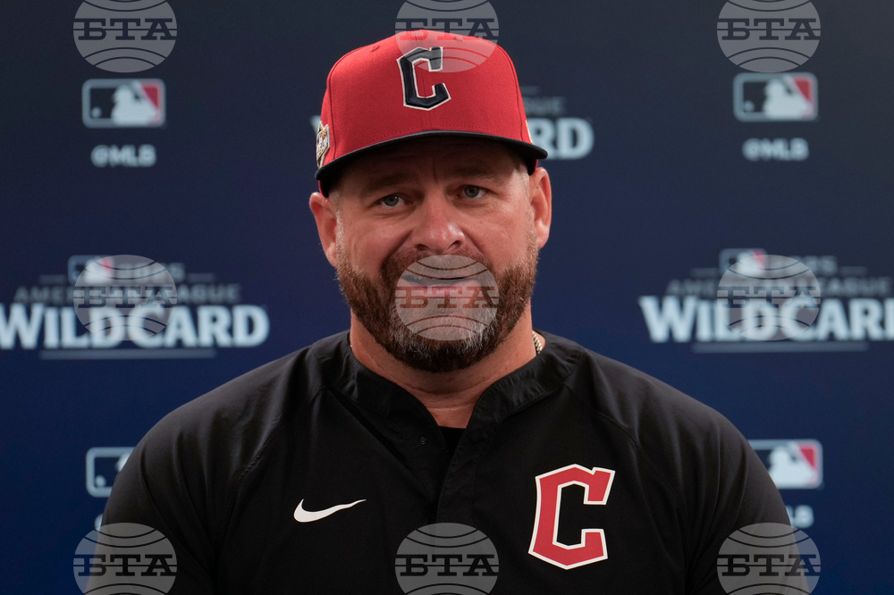 Cleveland Guardians manager Stephen Vogt speaks during a news conference after winning Game 2 of the American League Wild Card baseball playoff series against the Detroit Tigers in Cleveland, Wednesday, Oct. 1, 2025. (AP Photo/Sue Ogrocki)