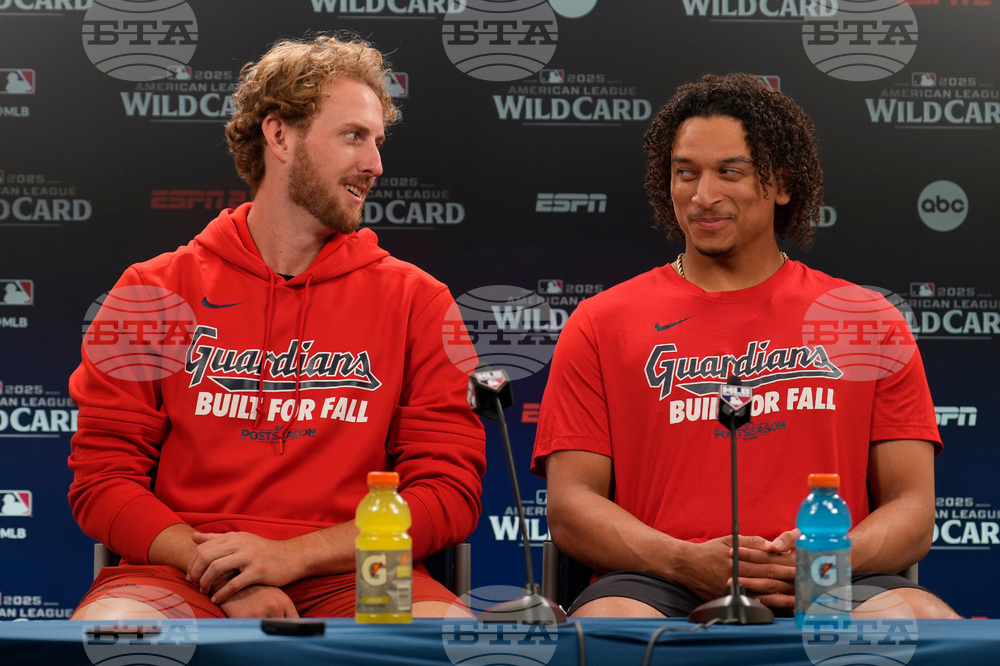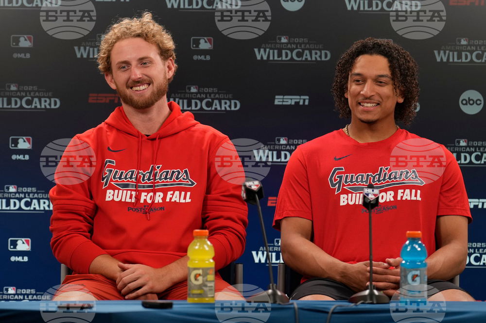 Cleveland Guardians pitcher Tanner Bibee, left, and catcher Bo Naylor, right, participate in a news conference after winning Game 2 of the American League Wild Card baseball playoff series against the Detroit Tigers in Cleveland, Wednesday, Oct. 1, 2025. (AP Photo/Sue Ogrocki)