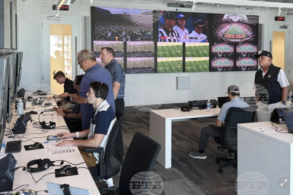 FILE - Alberto Riveron, second left, the Atlantic Coast Conference supervisor of football officials, works in the league's new gameday operations center, Saturday, Sept. 2, 2023, in Charlotte, N.C. (AP Photo/Aaron Beard, File)