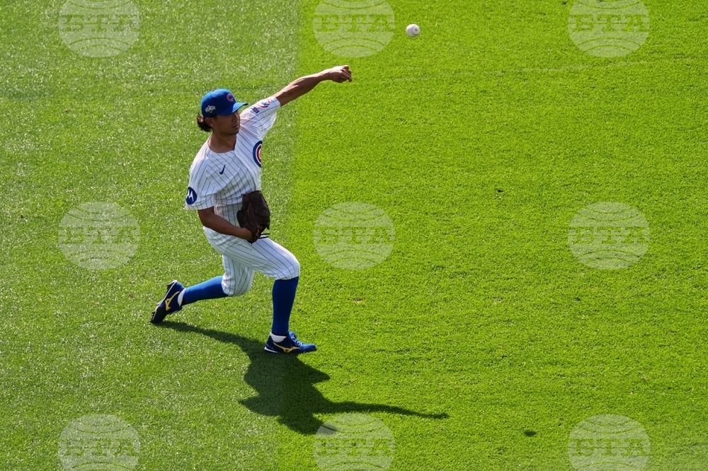 Chicago Cubs' Shota Imanaga warms up before Game 2 of a National League wild card baseball game against the San Diego Padres Wednesday, Oct. 1, 2025, in Chicago. (AP Photo/Nam Huh)