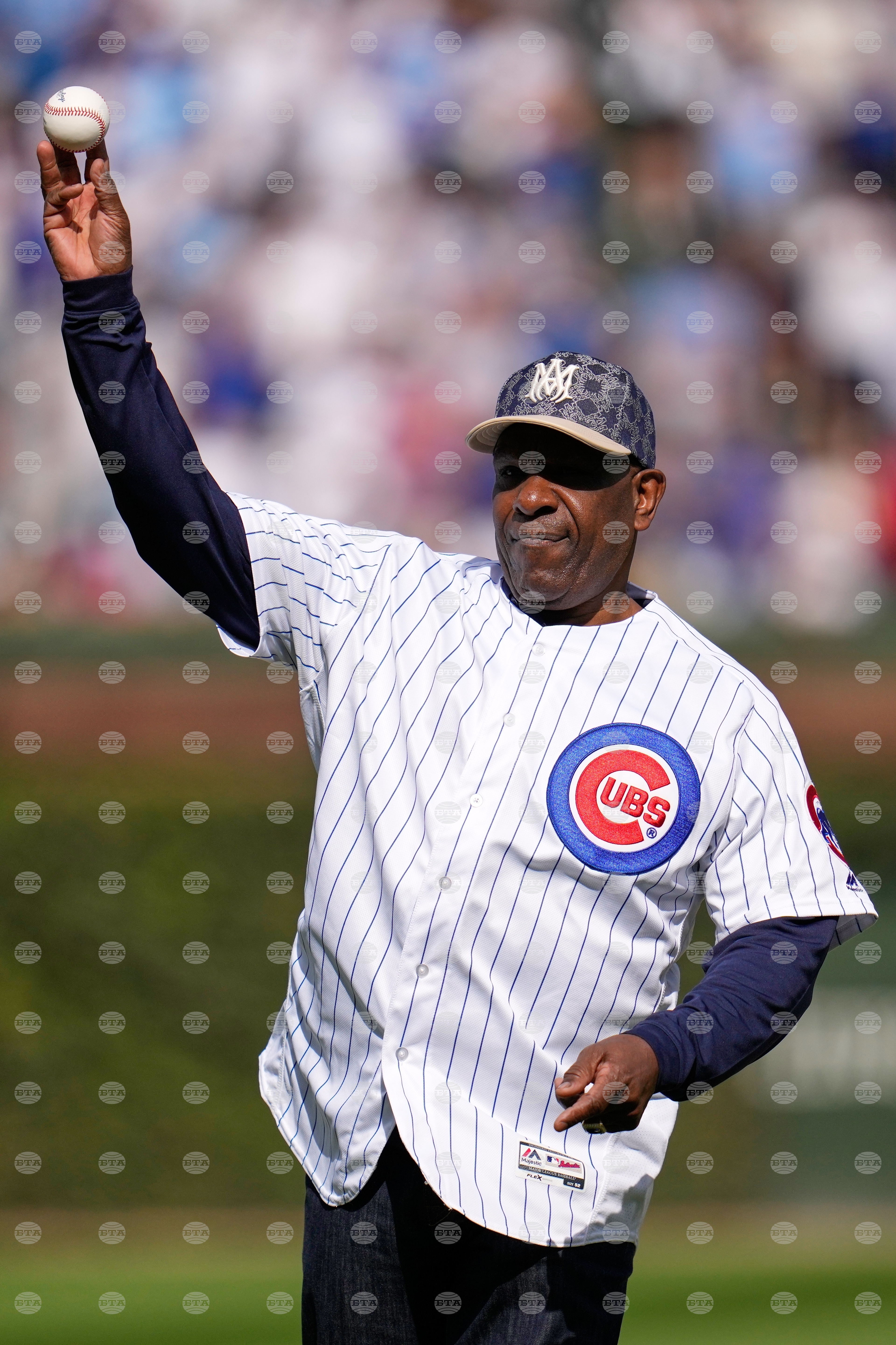 Andre Dawson throws a ceremonial first pitch before Game 2 of a National League wild card baseball game Wednesday, Oct. 1, 2025, in Chicago. (AP Photo/Erin Hooley)