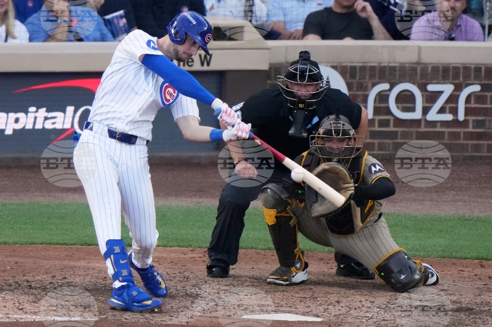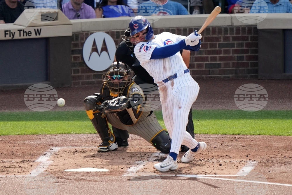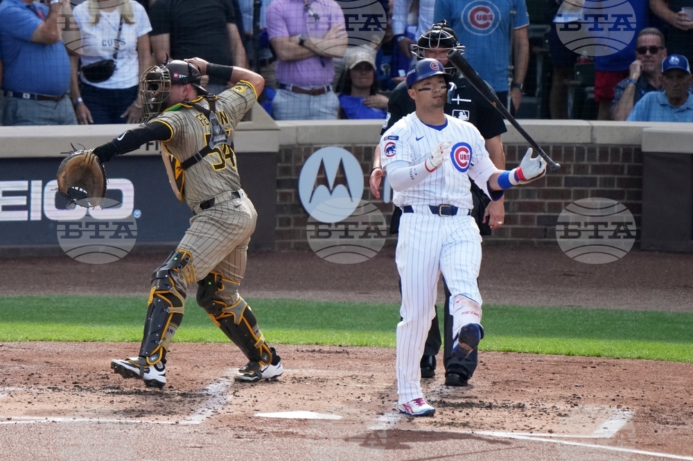 Chicago Cubs' Seiya Suzuki strikes out during the second inning of Game 2 of a National League wild card baseball game against the San Diego Padres Wednesday, Oct. 1, 2025, in Chicago. (AP Photo/Nam Huh)
