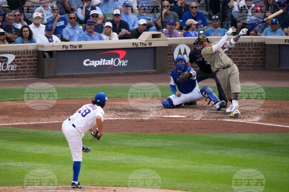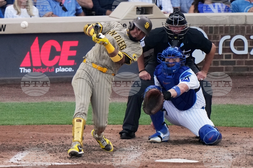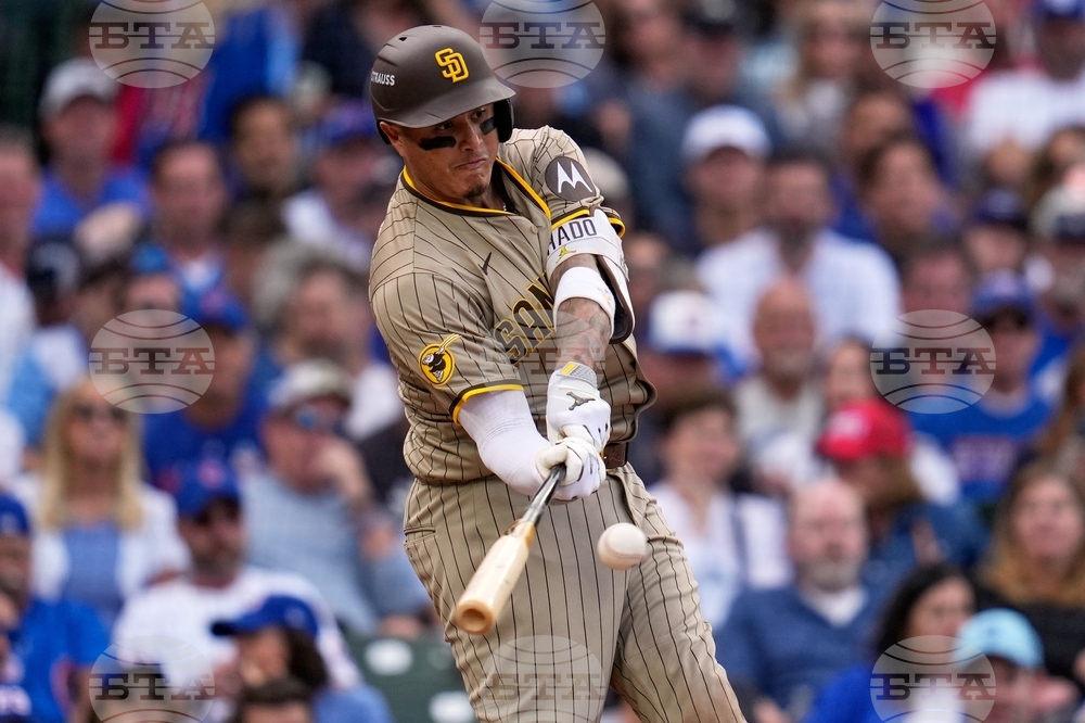 San Diego Padres' Fernando Tatis Jr. hits a single during the first inning of Game 2 of a National League wild card baseball game against the Chicago Cubs Wednesday, Oct. 1, 2025, in Chicago. (AP Photo/Nam Huh)