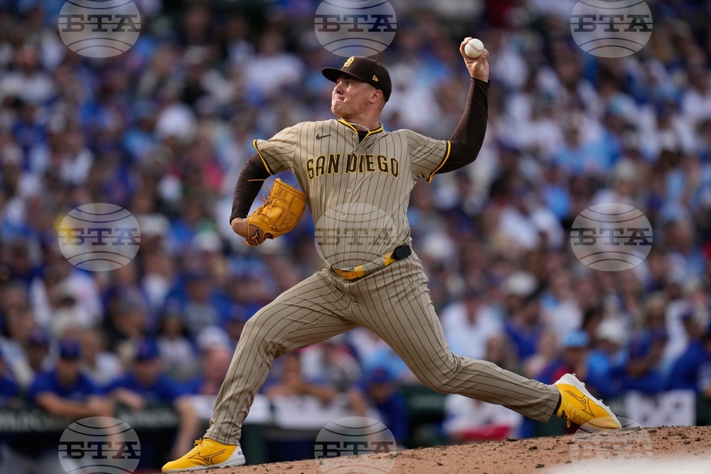 San Diego Padres' Dylan Cease throws during the first inning of Game 2 of a National League wild card baseball game against the Chicago Cubs Wednesday, Oct. 1, 2025, in Chicago. (AP Photo/Erin Hooley)