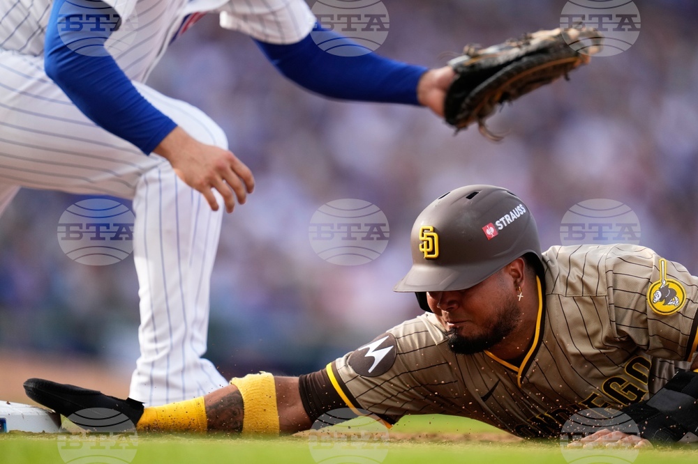 San Diego Padres' Luis Arraez makes it back to first on a pick off attempt during the seventh inning of Game 2 of a National League wild card baseball game against the Chicago Cubs Wednesday, Oct. 1, 2025, in Chicago. (AP Photo/Erin Hooley)