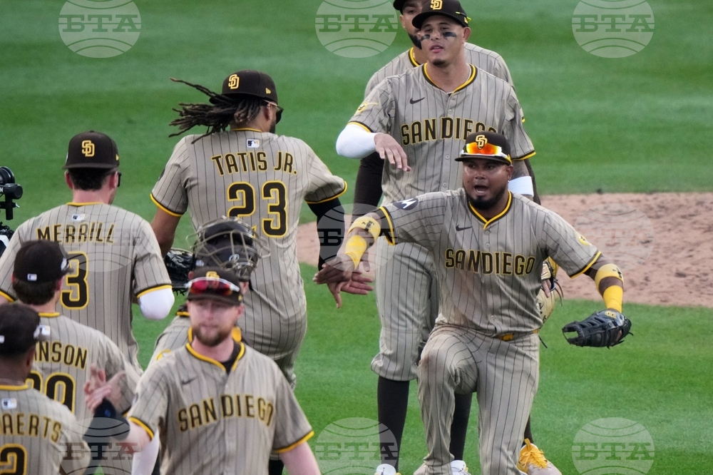 The San Diego Padres celebrate after Game 2 of a National League wild card baseball game against the Chicago Cubs Wednesday, Oct. 1, 2025, in Chicago. (AP Photo/Nam Huh)