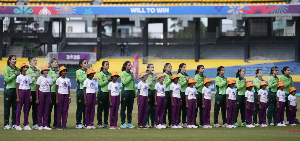 Pakistan's players sing their national anthem before the ICC Women's Cricket World Cup match between Bangladesh and Pakistan in Colombo, Sri Lanka, Thursday, Oct. 2, 2025.(AP Photo/Eranga Jayawardena)