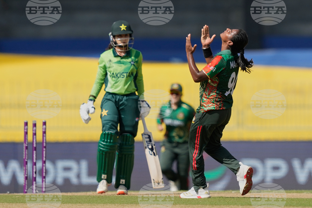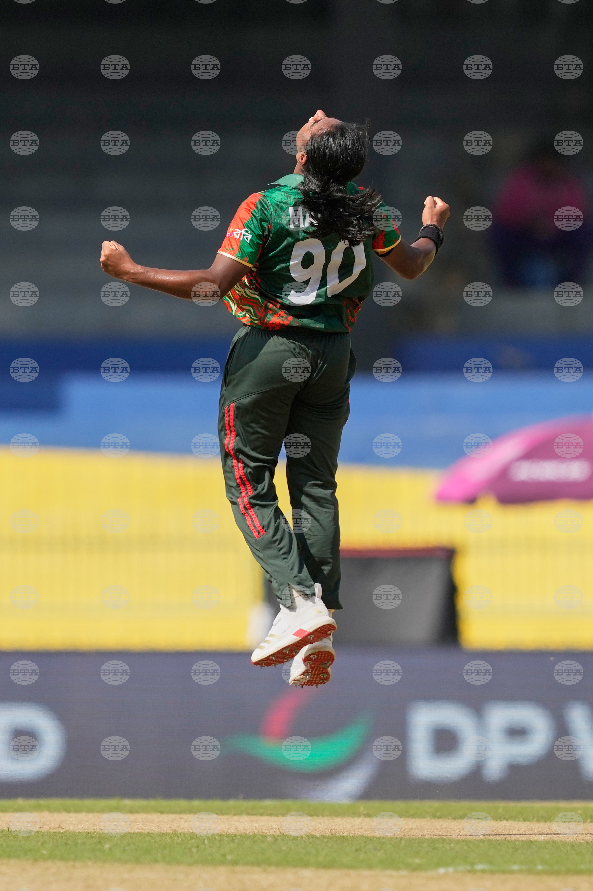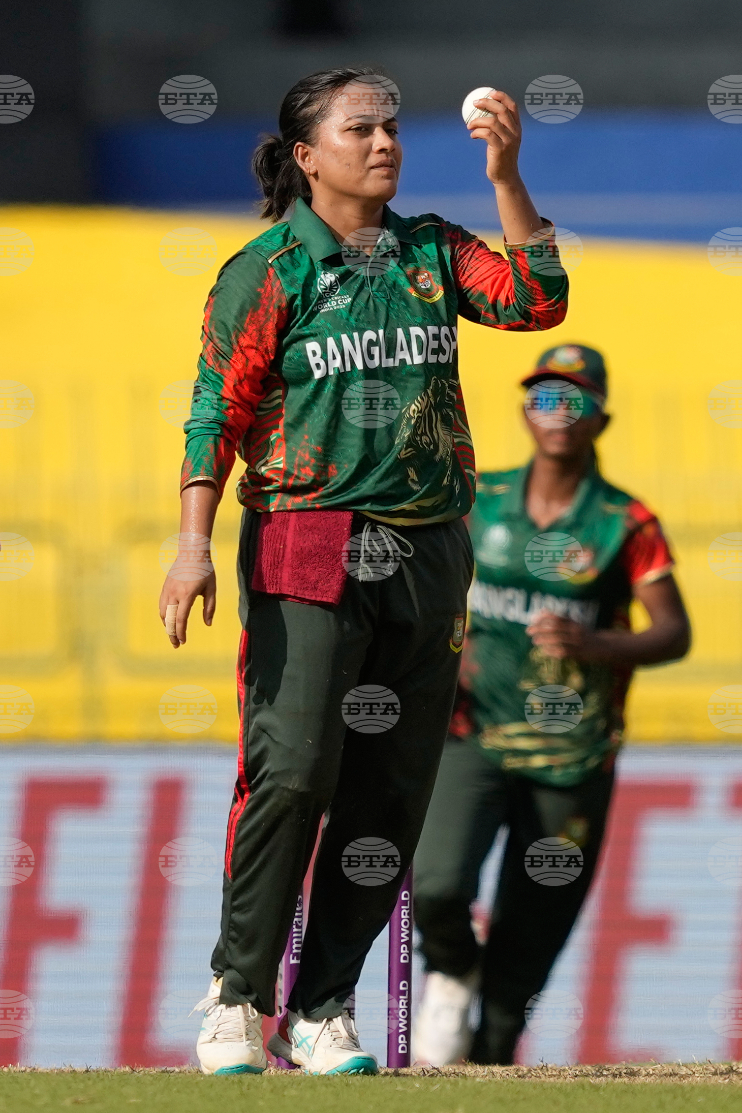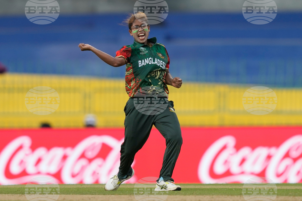 Bangladesh's Nahida Akter celebrates the wicket of Pakistan's Rameen Shamim during the ICC Women's Cricket World Cup match between Bangladesh and Pakistan in Colombo, Sri Lanka, Thursday, Oct. 2, 2025.(AP Photo/Eranga Jayawardena)