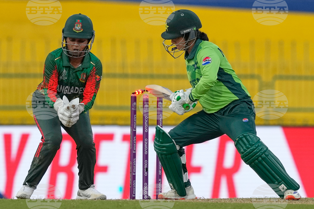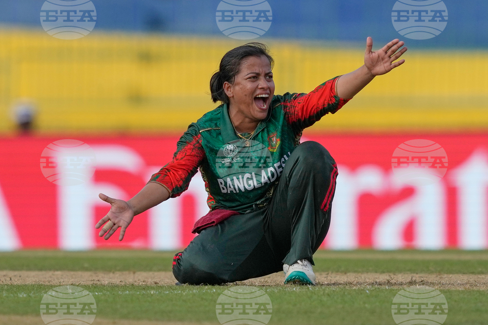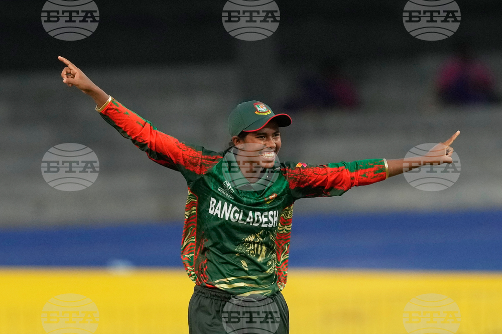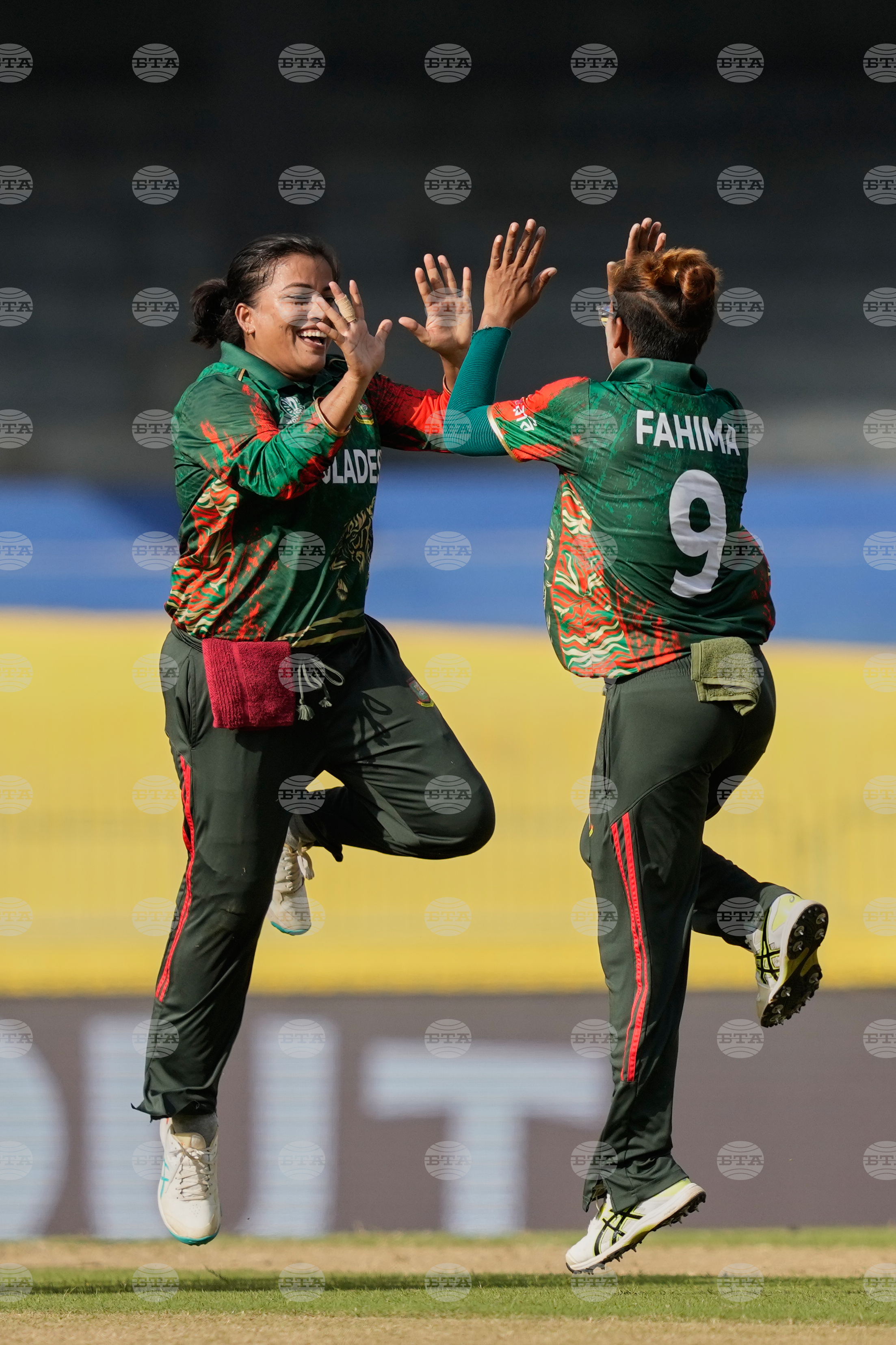 Bangladesh's Nahida Akter celebrates the wicket of Pakistan's Rameen Shamim during the ICC Women's Cricket World Cup match between Bangladesh and Pakistan in Colombo, Sri Lanka, Thursday, Oct. 2, 2025.(AP Photo/Eranga Jayawardena)