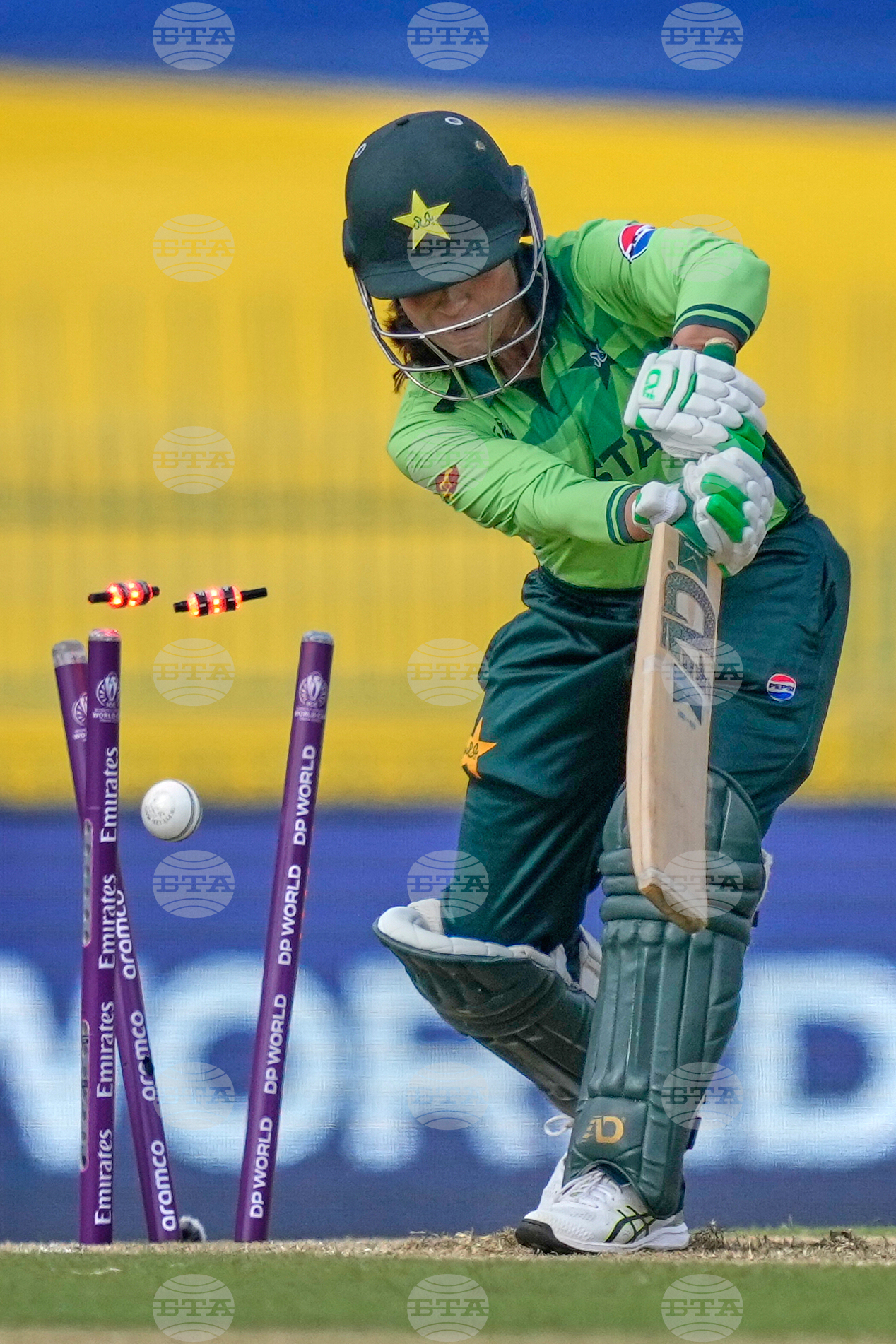 Pakistan's Omaima Sohail is bowled by Bangladesh's Marufa Akterthe during the ICC Women's Cricket World Cup match between Bangladesh and Pakistan in Colombo, Sri Lanka, Thursday, Oct. 2, 2025.(AP Photo/Eranga Jayawardena)