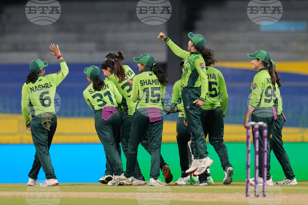 Pakistan's team members celebrate the wicket Bangladesh's Fargana Hoque during the ICC Women's Cricket World Cup match between Bangladesh and Pakistan in Colombo, Sri Lanka, Thursday, Oct. 2, 2025.(AP Photo/Eranga Jayawardena)