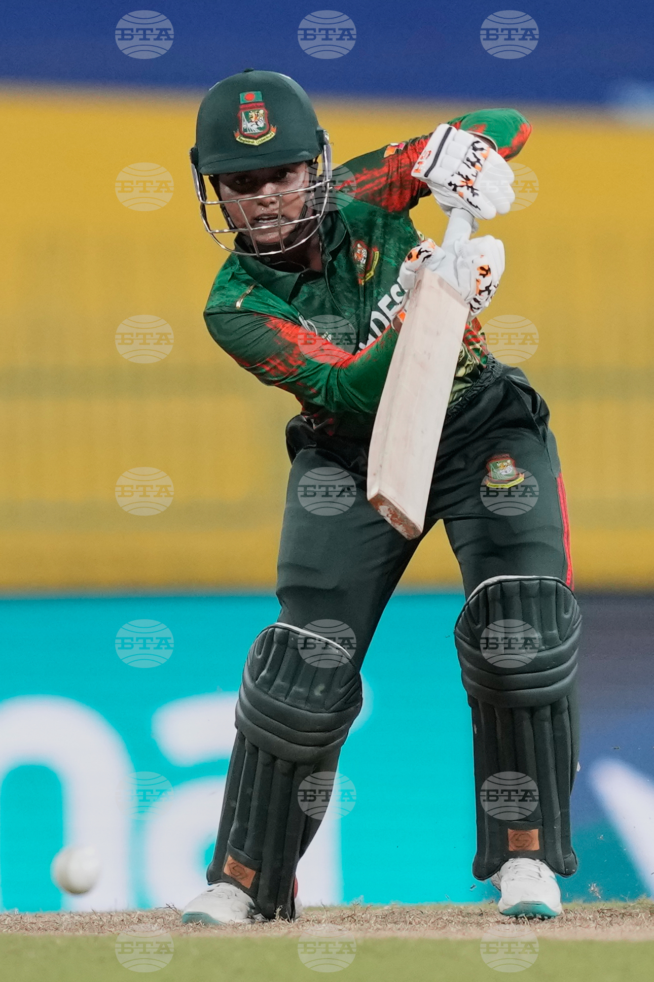 Bangladesh's Sharmin Akhter plays a shot during the ICC Women's Cricket World Cup match between Bangladesh and Pakistan in Colombo, Sri Lanka, Thursday, Oct. 2, 2025.(AP Photo/Eranga Jayawardena)