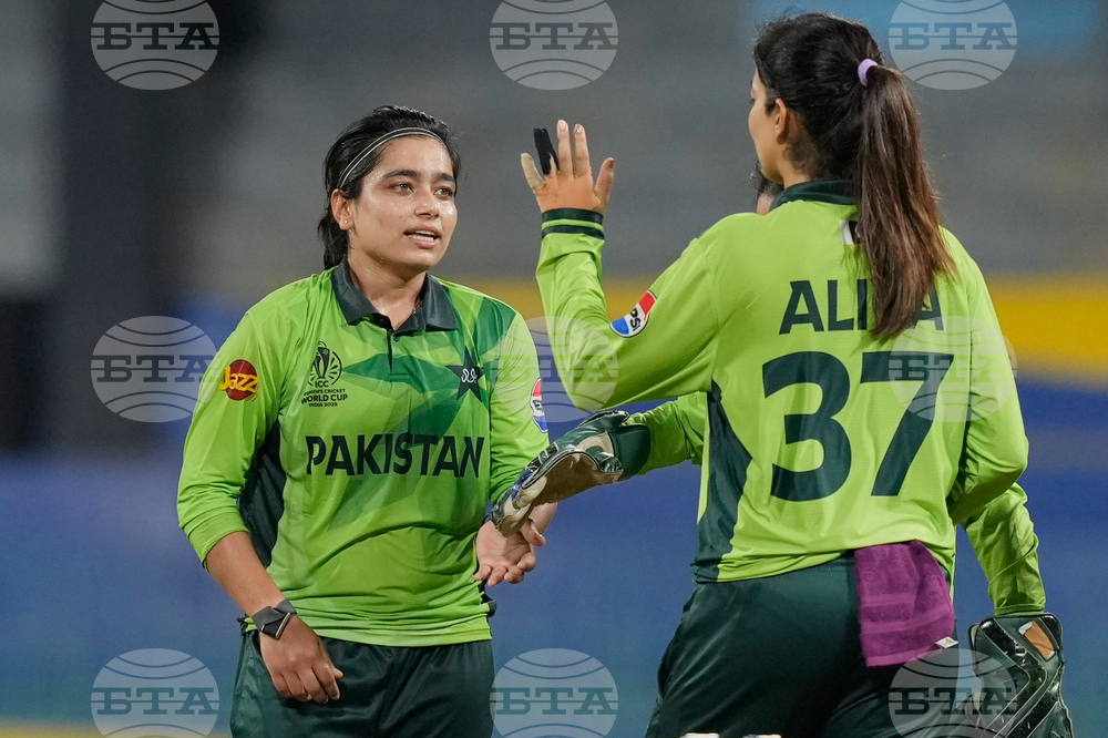 Pakistan's captain Fatima Sana, left, celebrates the wicket of Bangladesh's captain Nigar Sultana Joty with a teammate during the ICC Women's Cricket World Cup match between Bangladesh and Pakistan in Colombo, Sri Lanka, Thursday, Oct. 2, 2025.(AP Photo/Eranga Jayawardena)