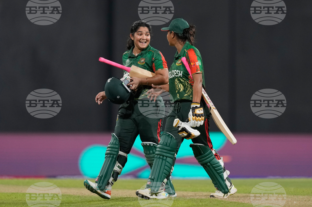 Bangladesh's Rubya Haider, right, and Sobhana Mostary celebrate their win in the ICC Women's Cricket World Cup match between Bangladesh and Pakistan in Colombo, Sri Lanka, Thursday, Oct. 2, 2025.(AP Photo/Eranga Jayawardena)