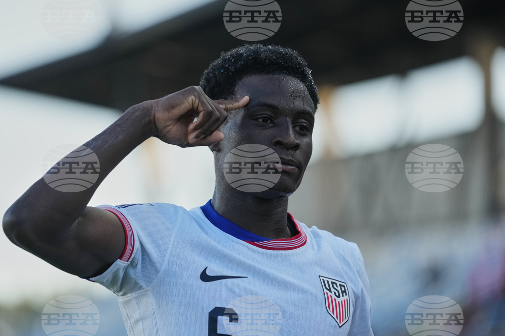 United States' Brooklyn Raines celebrates scoring his side's second goal against France during a FIFA U-20 World Cup Group E soccer match at El Teniente Stadium in Rancagua, Chile, Thursday, Oct. 2, 2025. (AP Photo/Andre Penner)