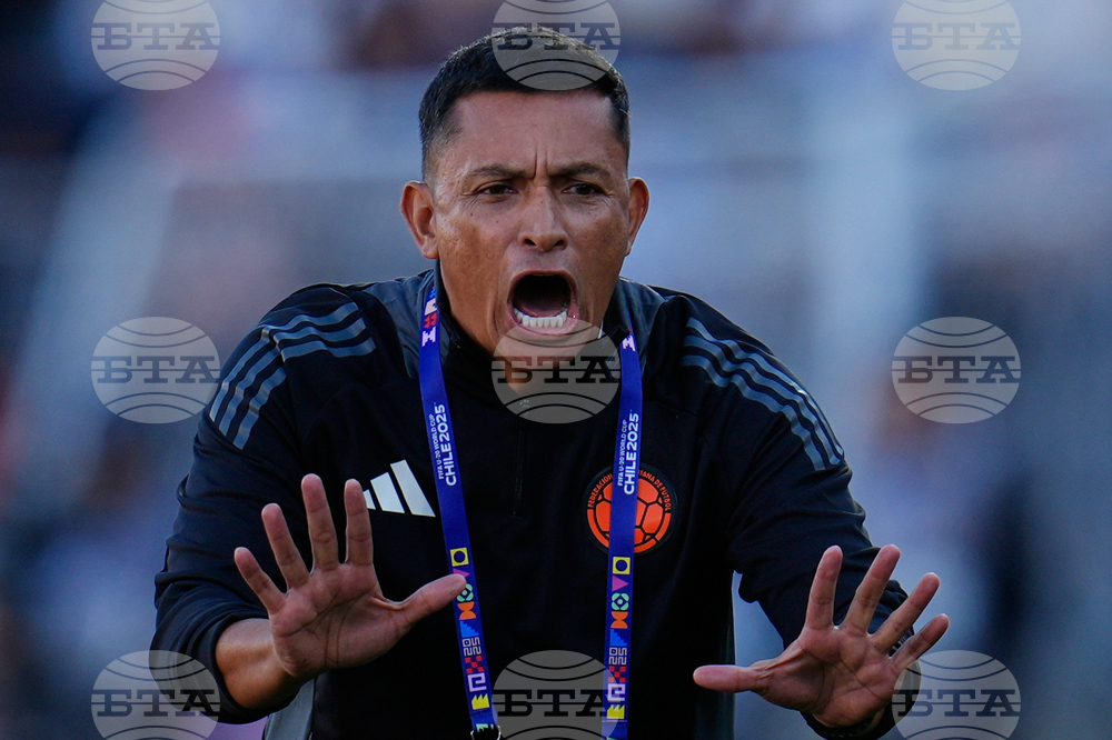 Colombia's coach Cesar Torres directs his players during a FIFA U-20 World Cup Group F soccer match against Norway at Fiscal Stadium in Talca, Chile, Thursday, Oct. 2, 2025. (AP Photo/Matias Delacroix)
