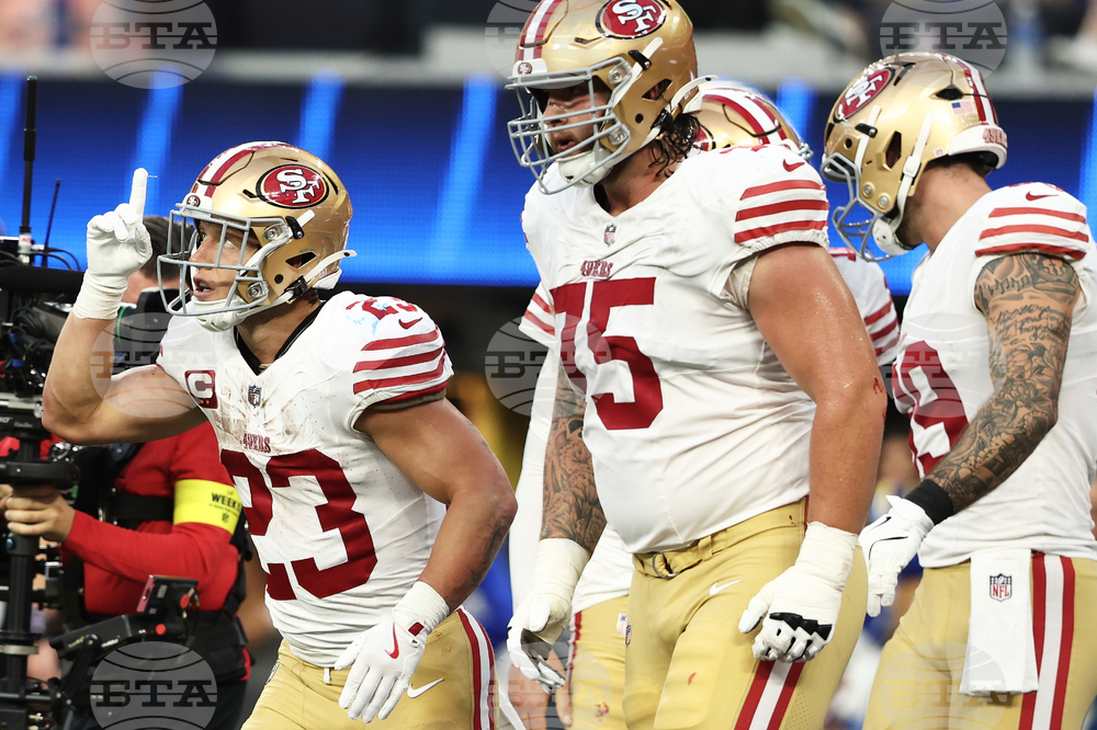 San Francisco 49ers running back Christian McCaffrey (23) celebrates with teammates after scoring against the Los Angeles Rams during the first half of an NFL football game, Thursday, Oct. 2, 2025, in Inglewood, Calif. (AP Photo/Jessie Alcheh)
