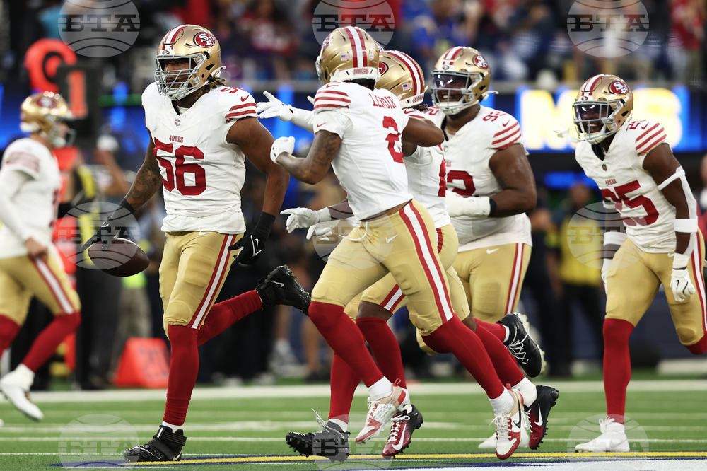 San Francisco 49ers' Trevis Gipson (56) celebrates after his second-quarter recovery of a fumble by Los Angeles Rams' Blake Corum (not shown) during an NFL football game in Inglewood, Calif., Thursday, Oct. 2, 2025. (Scott Strazzante/San Francisco Chronicle via AP)