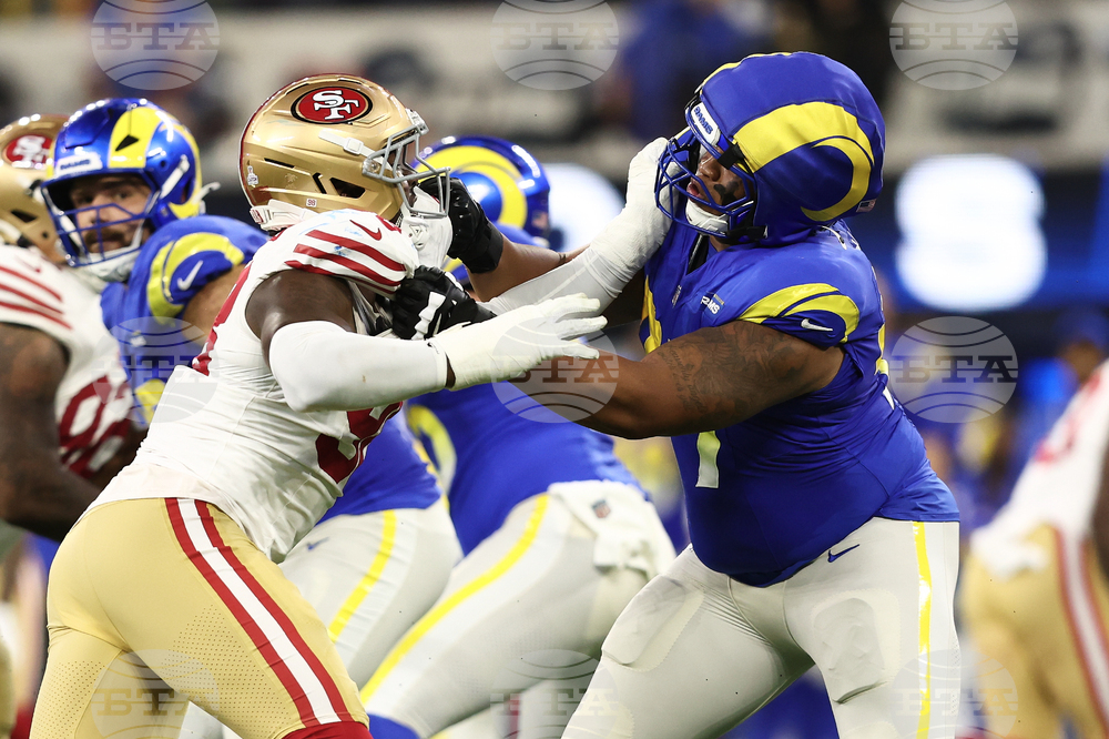 San Francisco 49ers defensive end Mykel Williams, foreground left, rushes the passer while being blocked by Los Angeles Rams offensive tackle Alaric Jackson during the second half of an NFL football game, Thursday, Oct. 2, 2025, in Inglewood, Calif. (AP Photo/Jessie Alcheh)