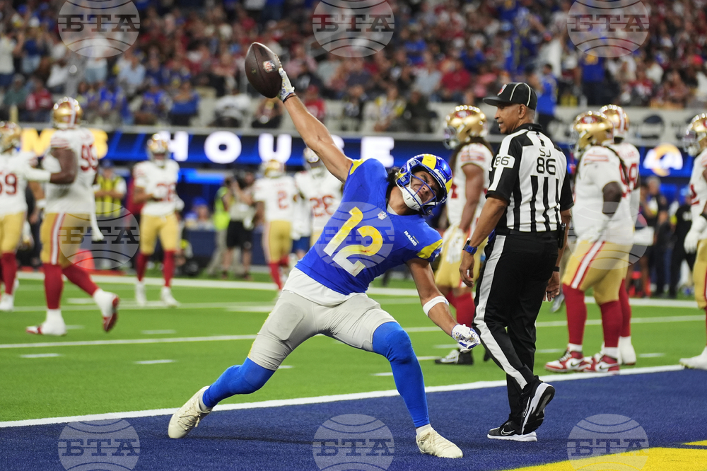 Los Angeles Rams wide receiver Puka Nacua (12) celebrates after scoring against the San Francisco 49ers during the second half of an NFL football game, Thursday, Oct. 2, 2025, in Inglewood, Calif. (AP Photo/Marcio Jose Sanchez)